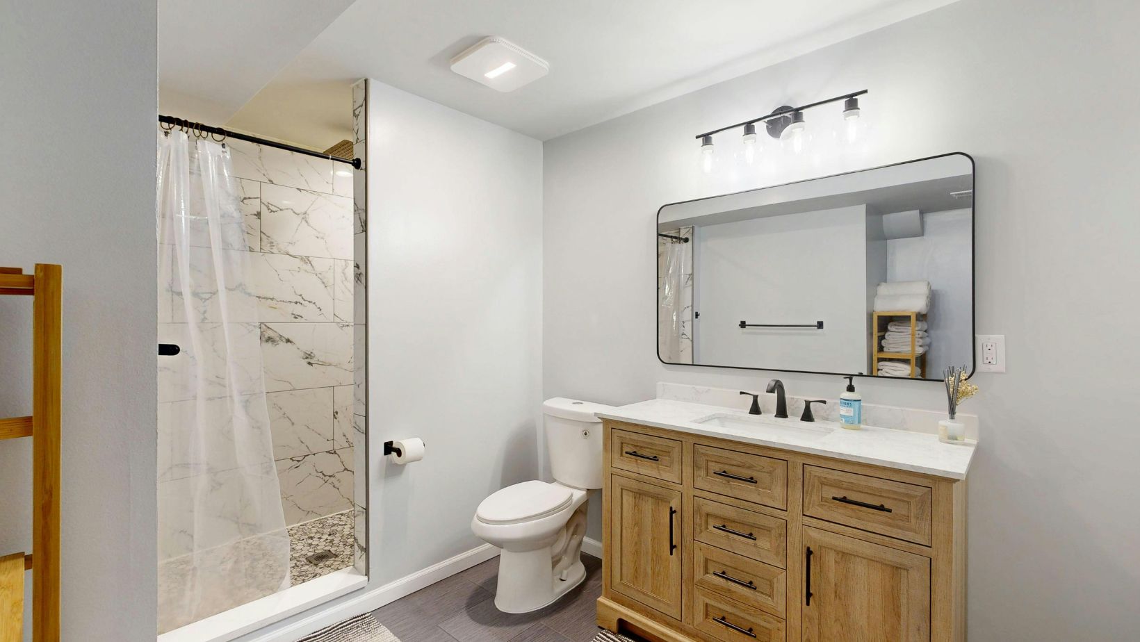 There is also a psychological piece. People often want a small vanity so the room feels bigger, but then they fill the counter because there is nowhere else for items to go. The result is the opposite of what they wanted: the room looks busy and feels tight. Planning storage beyond the vanity is what prevents that.